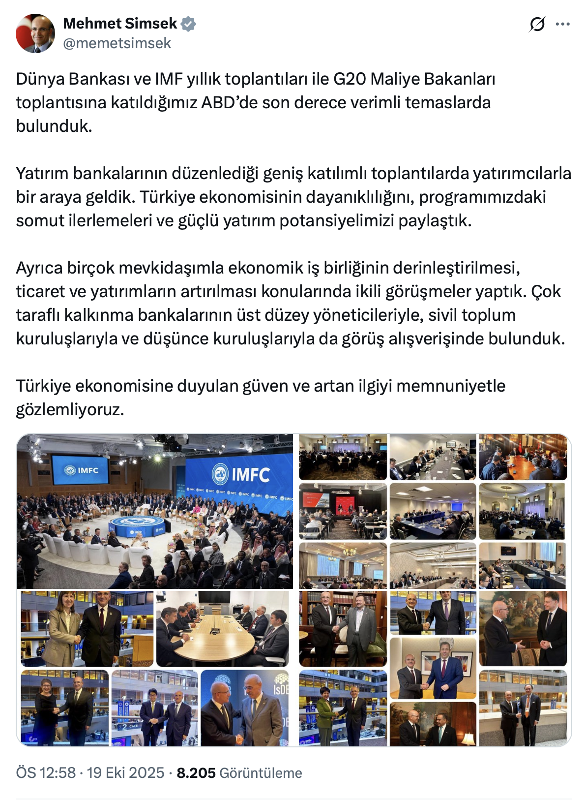 Hazine ve Maliye Bakanı Mehmet Şimşek, Dünya Bankası ve Uluslararası Para Fonunun (IMF) yıllık toplantıları ile G20 Maliye Bakanları toplantısına katıldığı ABD’de son derece verimli temaslarda bulunduklarını bildirerek, “Türkiye ekonomisine duyulan güven ve artan ilgiyi memnuniyetle gözlemliyoruz” ifadesini kullandı.