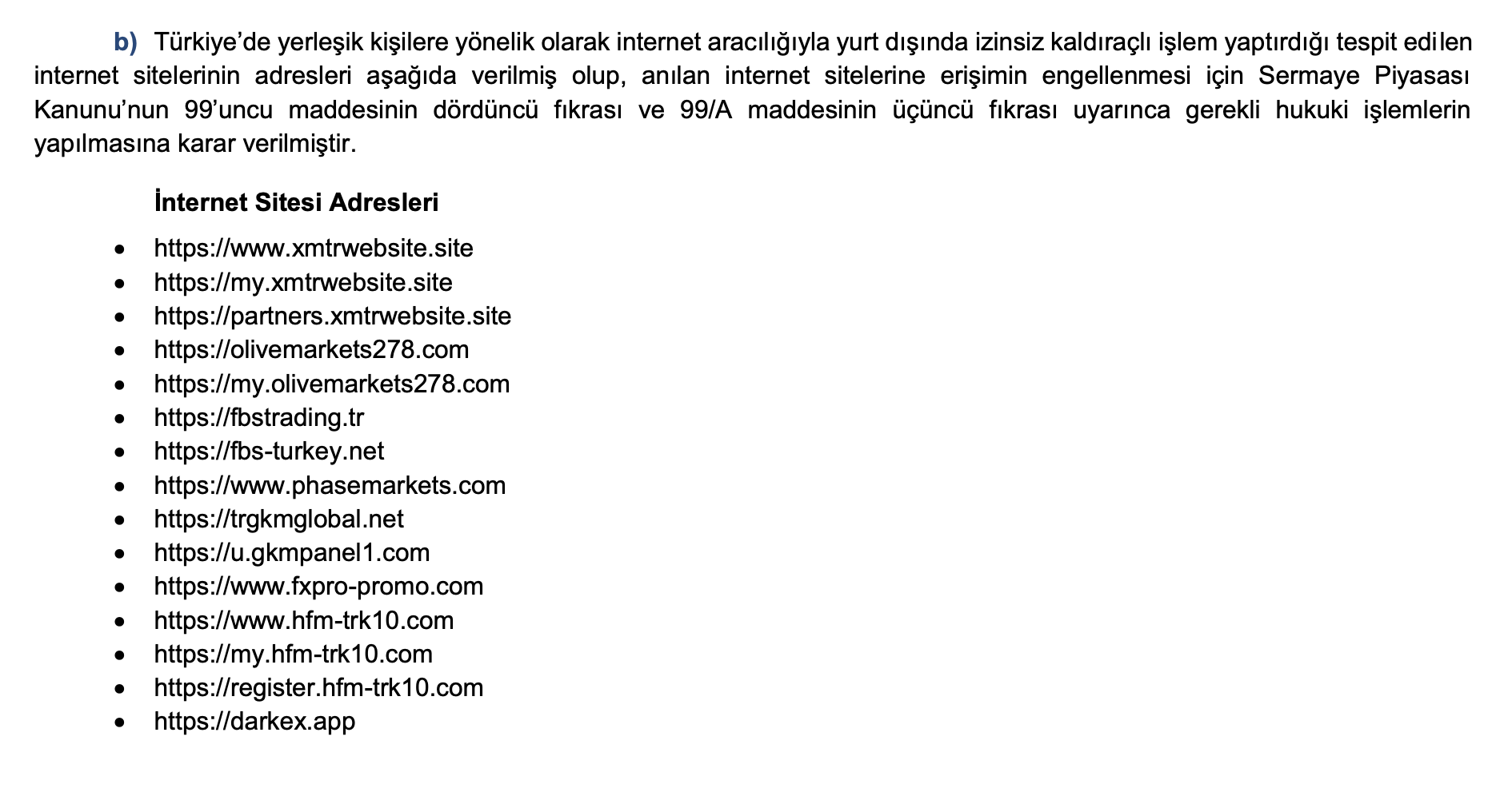 Sermaye Piyasası Kurulu’nun (SPK) haftalık bülteninde duyurulan habere göre; Türkiye’de yerleşik kişilere yönelik olarak internet aracılığıyla yurt dışında izinsiz kaldıraçlı işlem yaptırdığı tespit edilen internet sitelerine erişimin engellenmesi için Sermaye Piyasası Kanunu’nun 99’uncu maddesinin dördüncü fıkrası ve 99/A maddesinin üçüncü fıkrası uyarınca gerekli hukuki işlemlerin yapılmasına karar verildiği belirtildi. Hakkında hukuki işlem yapılacak internet siteleri şunlar: